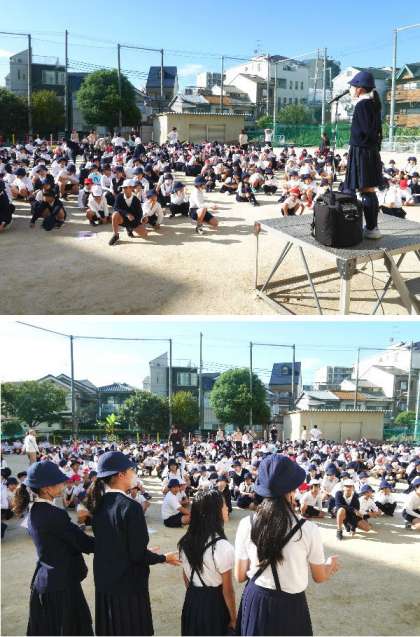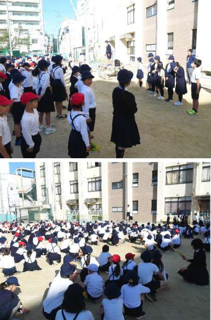 児童集会が運動場でおこなわれました。たて割り班で集合して、集会委員会の出題するイントロクイズに答えました。