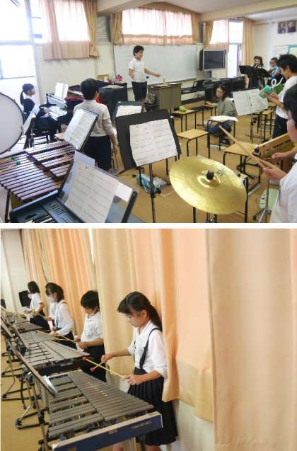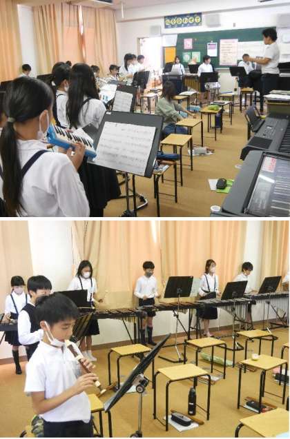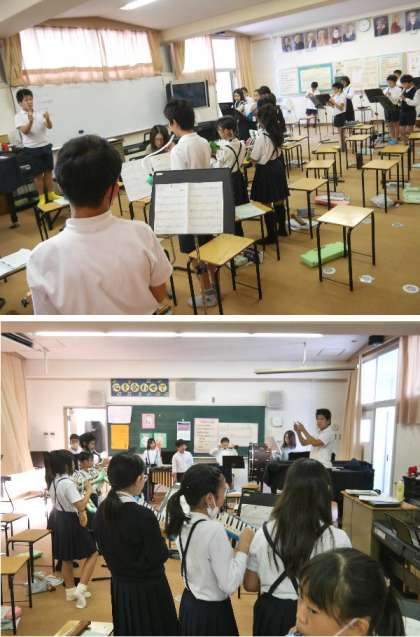 5年生では合奏の全体練習をしていました。指揮者の指揮にあわせて、全員が合奏します。指揮者がかなめです。
