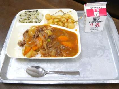 今日の献立は、ハヤシライス、キャベツのひじきドレッシング、さくらんぼ(缶)、牛乳でした。