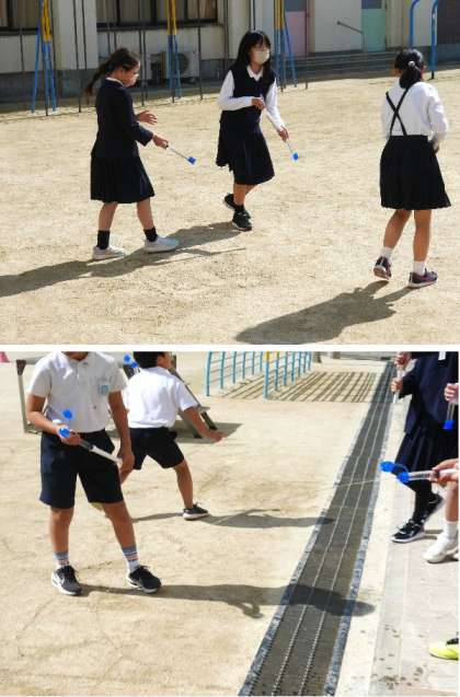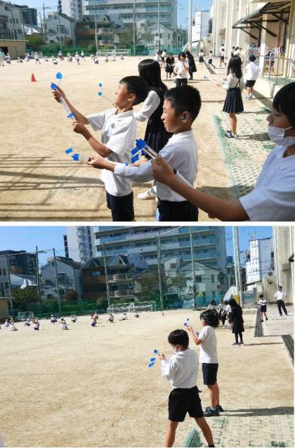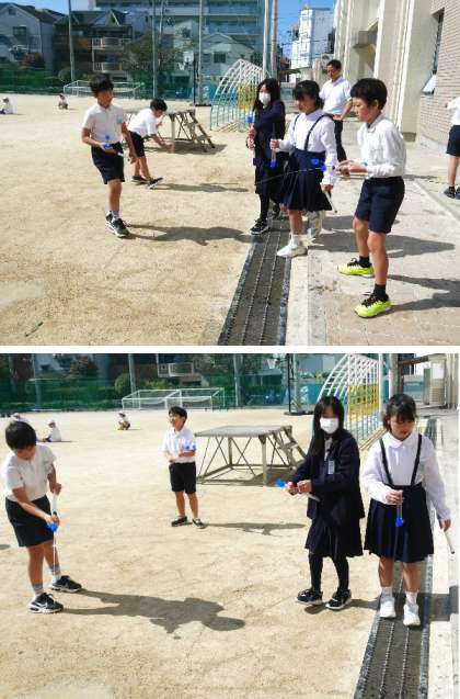 4年生の理科では、水のちからについて学習しています。水てっぽうでどこまで水がとぶのか調べています。