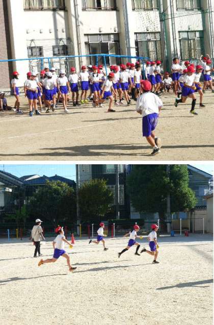 4年生が全体で体育をしていました。ソフトボールを投げて走っています。これからの野球のゲームの練習もかねてます。