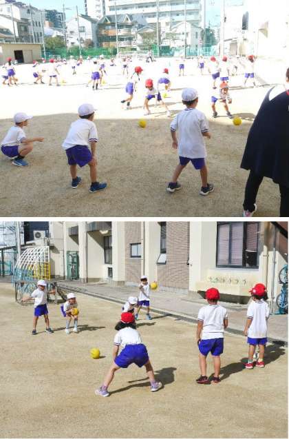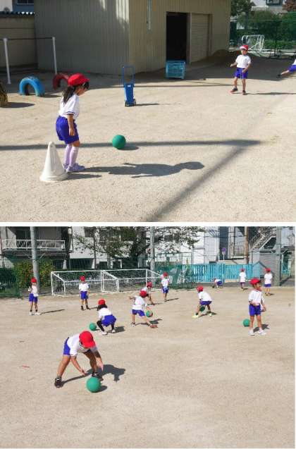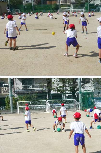 1年生が、ボールを使って、ころがたりして慣れ親しんでいます。いろいろなゲームができると楽しいですね。
