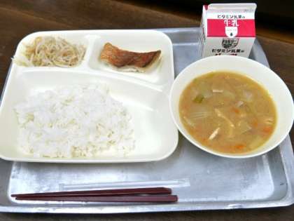 今日の献立は、赤魚のしょうゆだれかけ、豚汁、もやしのゆずの香あえ、ごはん、牛乳でした。