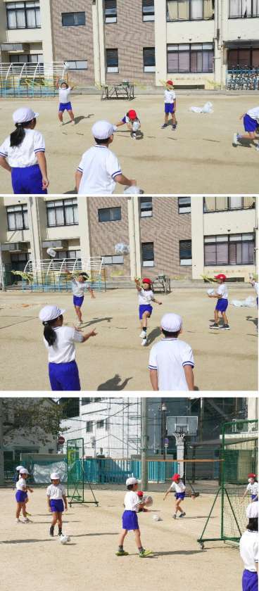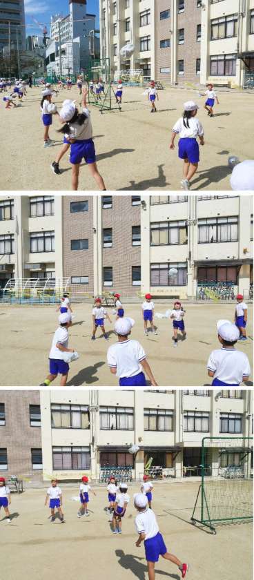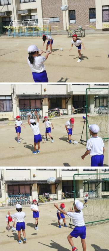2年生では、ビニール袋に新聞紙をまるめていれたボールを作って、コートで分かれて、ボールを投げ入れるゲームを練習しました。ボールを使った運動やゲームを楽しみながら学んでいきます。