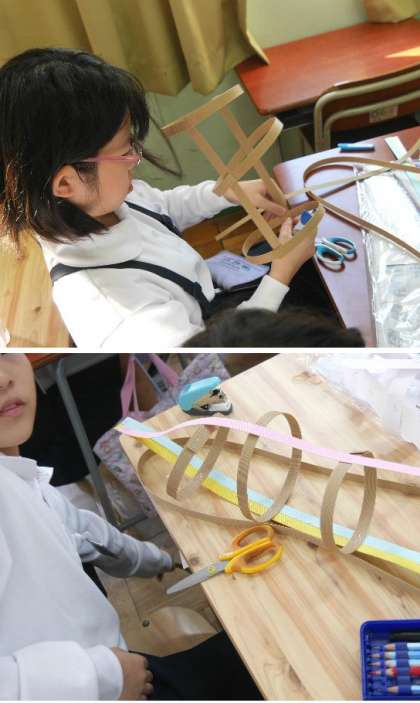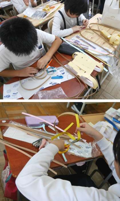 4年生では、紙バンドをつないですてきな作品づくりにとの組んでいます。
