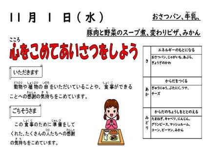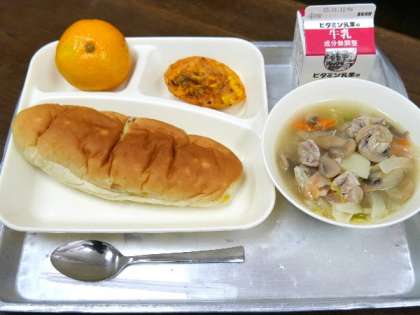 今日の献立は、豚肉と野菜のスープ煮、変わりピザ、みかん、おさつパン、牛乳でした。新聞委員の児童が、新聞の記事を作るために、1年生に遠足の感想を聞きにきていました。