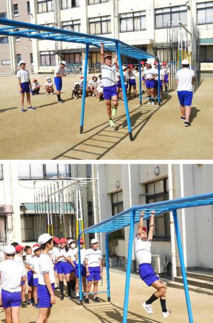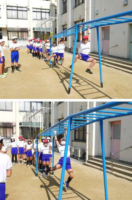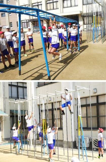 6年生が、80周年記念で設置していただいた「うんてぃ」で運動しています。どこまでいけるかな。