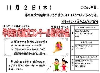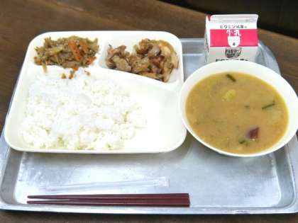 今日の献立は、体ポカポカ鶏肉のしょうが焼き、ほくほくさつまいもみそ汁、ピリッとひき肉きんぴらごぼう、ごはん、牛乳でした。