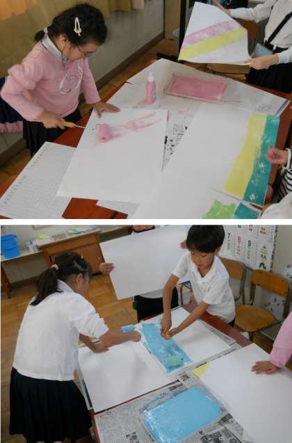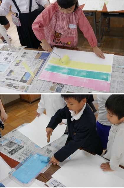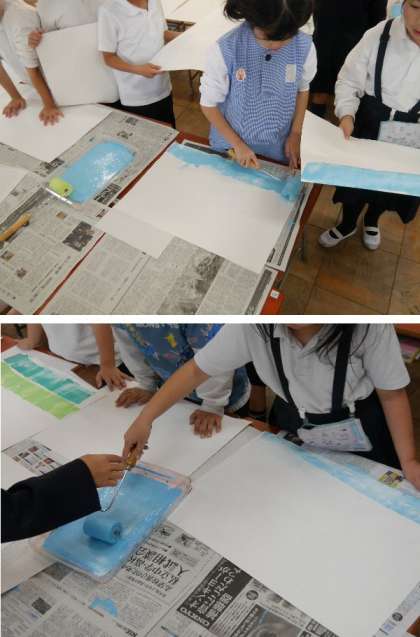 2年生では、おさかな号の絵を描いています。そのおさかな号がおよぐ海の絵を、ローラーを使って作っています。きれいですね。
