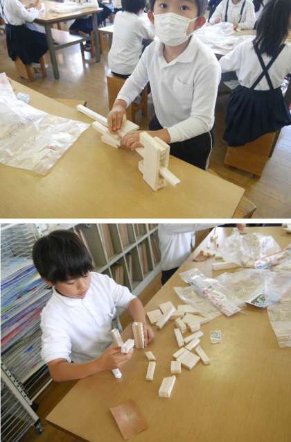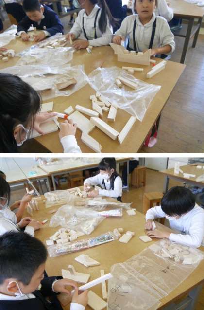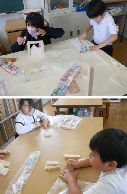 3年生の図工では、木材をのこぎりで切って、ボンドで貼り付けて作品を作っています。