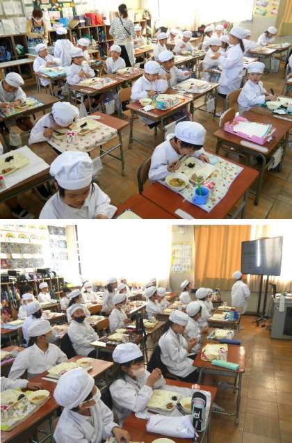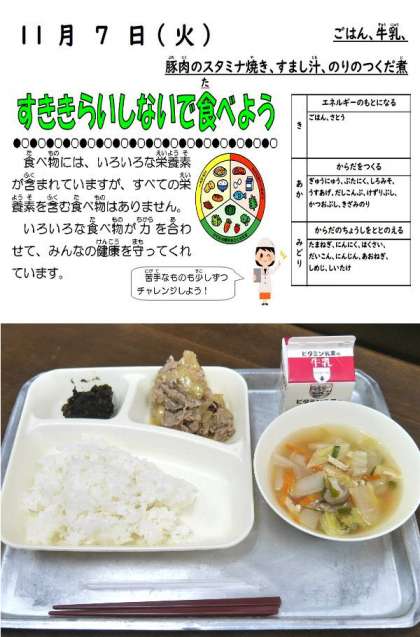 今日の献立は、豚肉のスタミナ焼き、すまし汁、のりのつくだ煮、ごはん、牛乳でした。