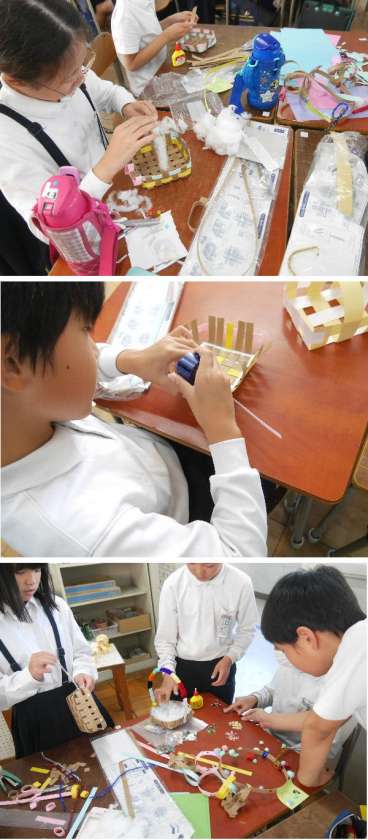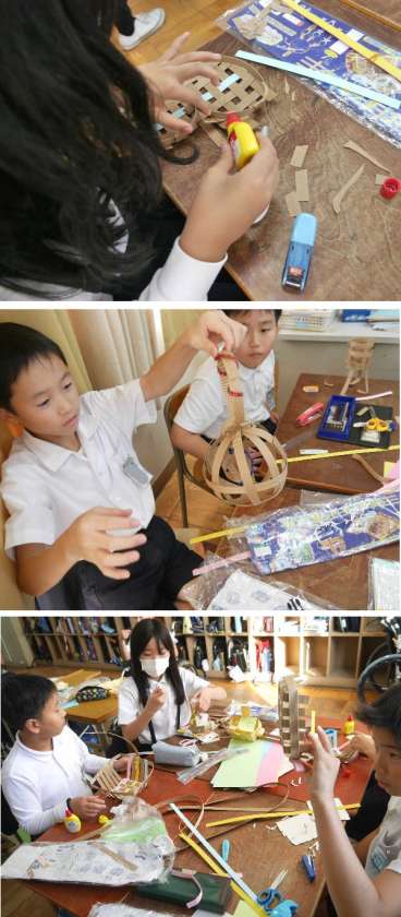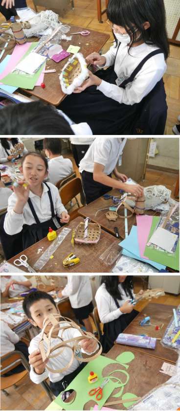 4年生の図工では、クラフト紙テープを使った作品を作っています。テープを編んだりして、かごなどを作っていました。