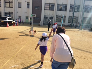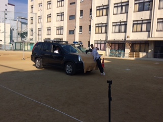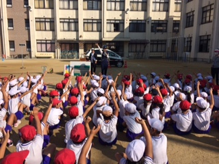 1年生、2年生は道路の歩き方を練習しています。信号が青でも、右左の安全を確認してから渡ります。
