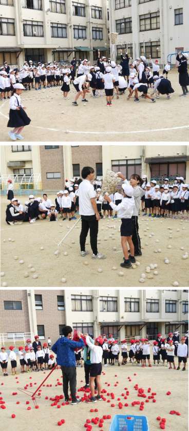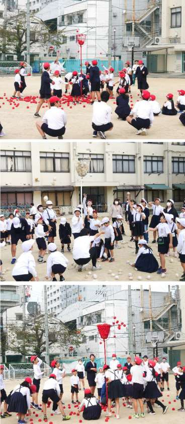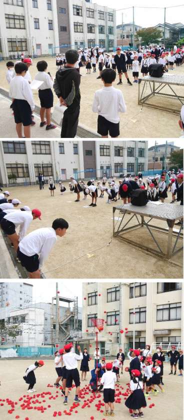 今日の児童集会は運動委員会による運動集会です。ペア学年の1年生と6年生で玉入れをしました。赤と白に分かれて盛りあがりました。