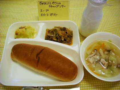 今日の献立は、「牛肉と野菜のケチャップソテー、スープ、スイートポテト、黒糖パン、牛乳」です。