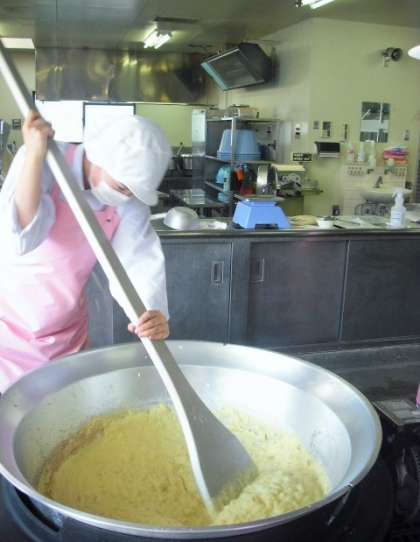 スイートポテトは秋が旬のさつまいもを使ったデザートです。柔らかく煮たさつまいもにバターやクリーム、牛乳、砂糖を加えてから焼き物機で焼いています。甘さ控えめでさつまいものおいしさがよく出ていました。子どもたちからは「バターの味がしておいしい。」と好評でした。