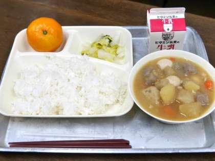 今日の献立は、関東煮、はくさいの甘酢あえ、みかん、ごはん、牛乳でした。