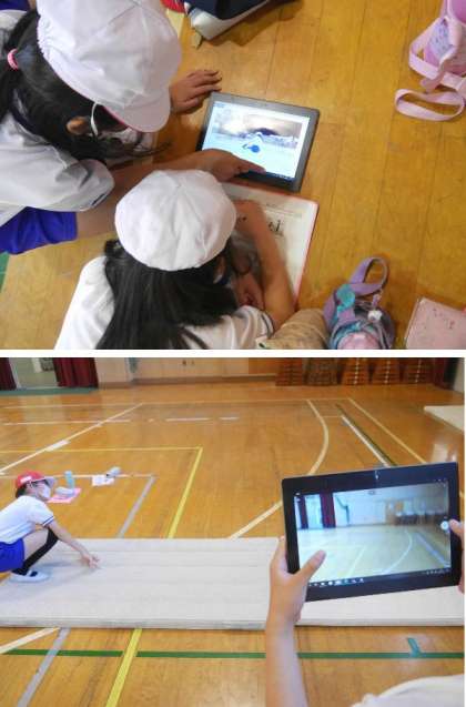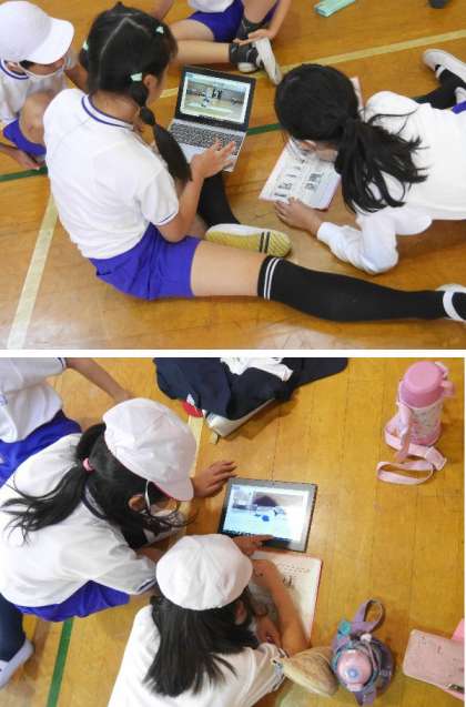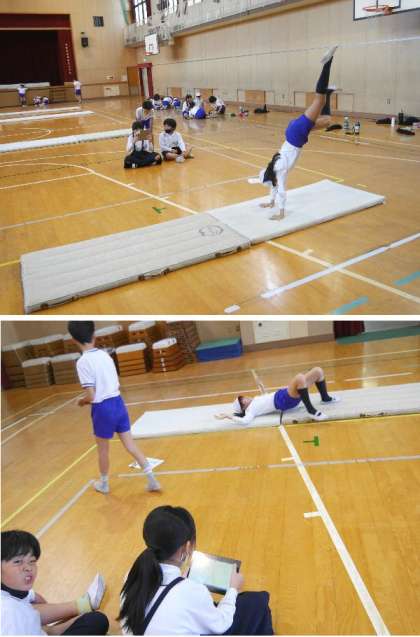 5年生の体育ではマット運動をしています。倒立前転をパソコンで撮影して、ホームを確認していました。