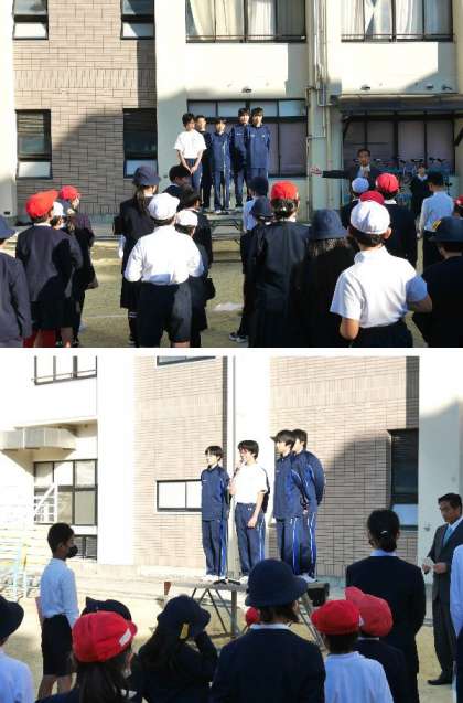 今日と明日の2日間、桜宮小学校の中学2年生5人が、小学校にきて職場体験学習をおこないます。正門で登校してくの児童たちにあいさつをしてくれました。