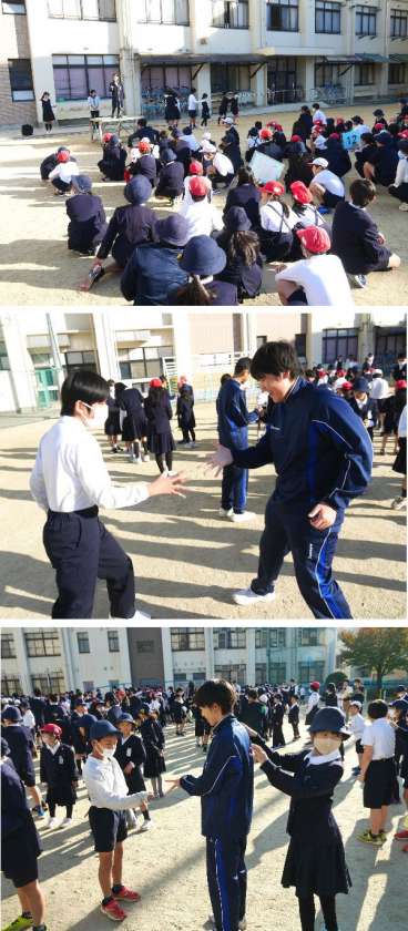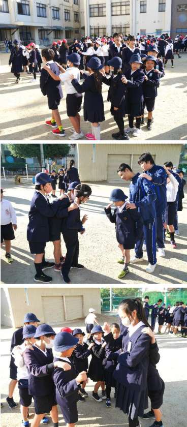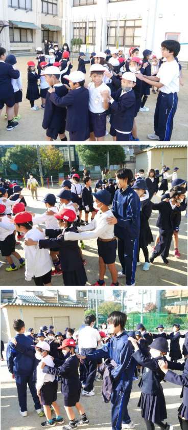 今日は、児童集会が行われました。たて割り班で集合しました。お互いに近くの人とじゃんけんをして、負けたら後ろにつきます。繰り返してじゃんけんして、どんどん列が長くなっていきます。職場体験学習にきている中学生も参加しました。