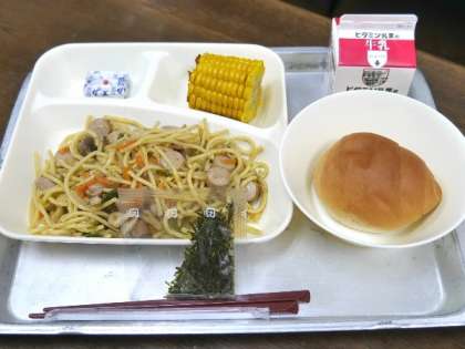 今日の献立は、ウインナーときのこの和風スパゲッティ、焼きとうもろこし、固形チーズ、黒糖パン、牛乳でした。