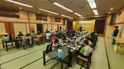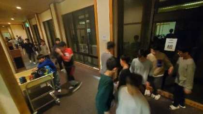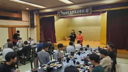 夕食の時間です。水筒を持ってきて、お茶をいれてもらいます。 係の児童が、いただきます。
