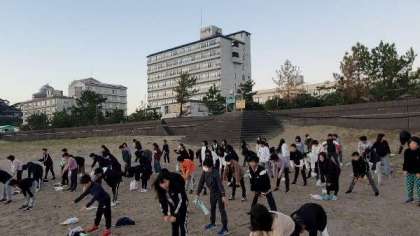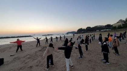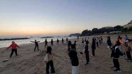ラジオ体操で元気よくしている間に、朝日がさしてきました。