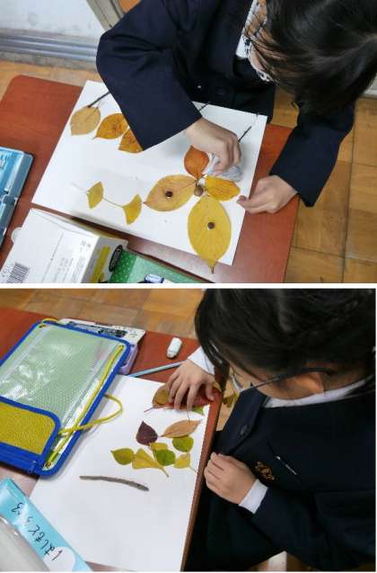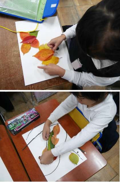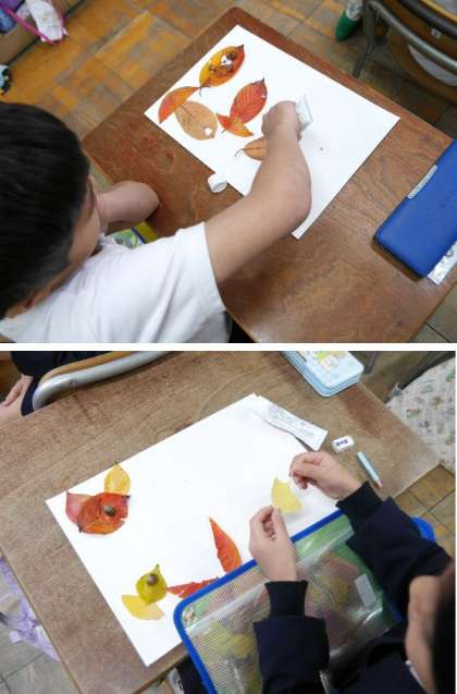 1年生は、さっそく、公園でひろってきた落ち葉などを使って、作品づくりをしていました。落ち葉がとってもきれいですね。