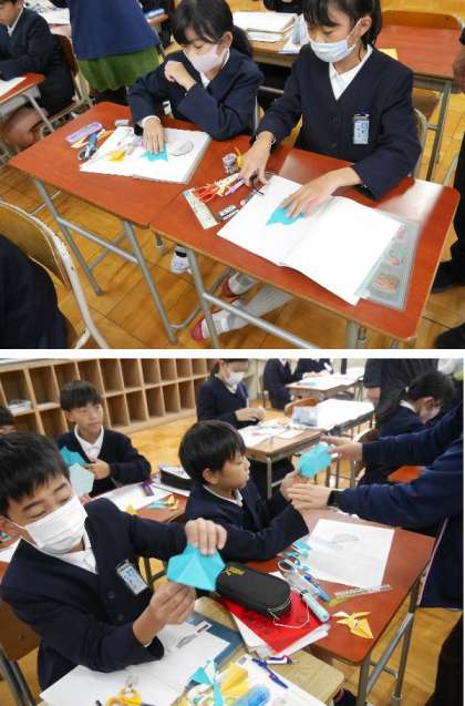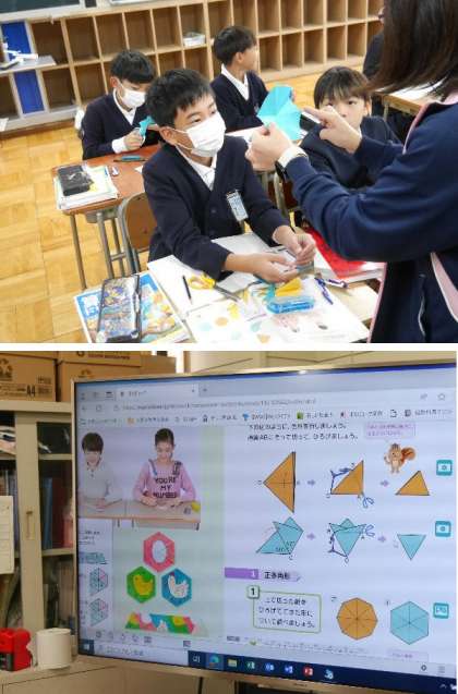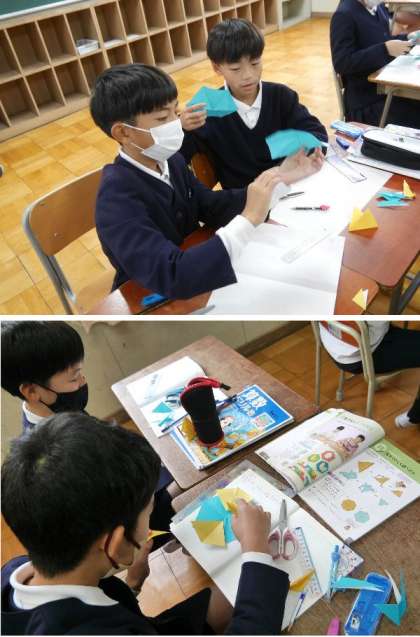 5年生の算数は、習熟度別少人数授業でおこなっています。円をくわしく調べようの正多角形の学習をしています。折り紙で正六角形を作って確認しています。