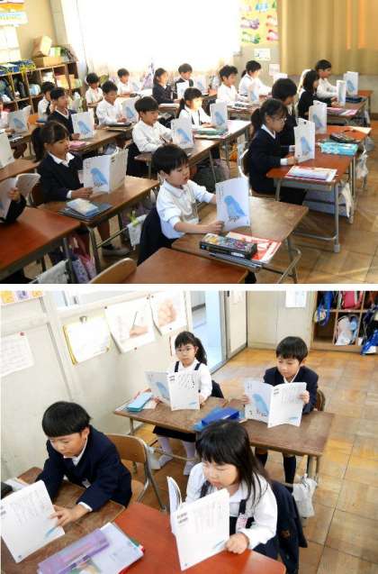 1年生が国語の教科書「なにに見えるかな」を音読しています。先日、秋さがしをして、落ち葉やどんぐりを拾って、いろんな形のものを作りましたね。
