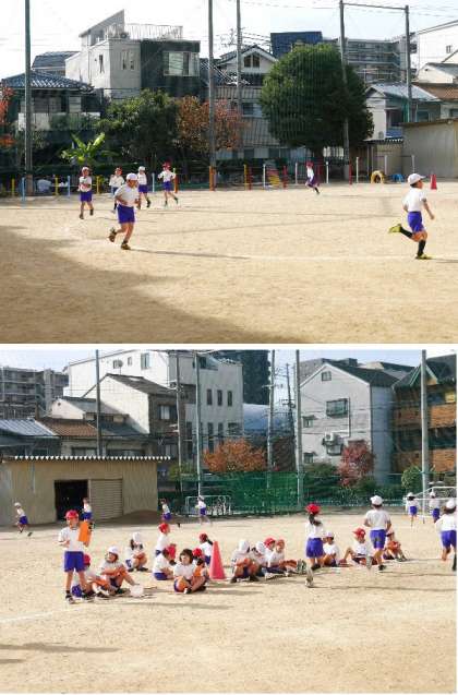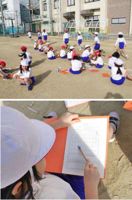 2年生の体育では、5分間の持久走をしていました。ペアになって、何周走れたかチェックをしています。