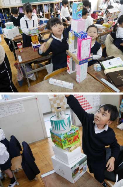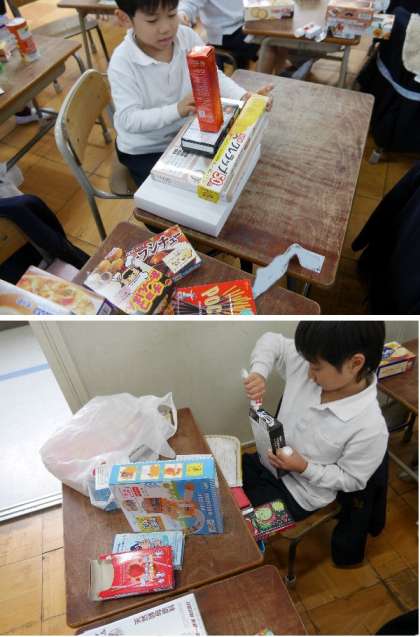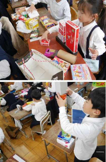 1年生では、お家からもちよった空き箱を使って、ボンドで接着してつなげて作品を作っています。いろんな空き箱があってカラフルです。
