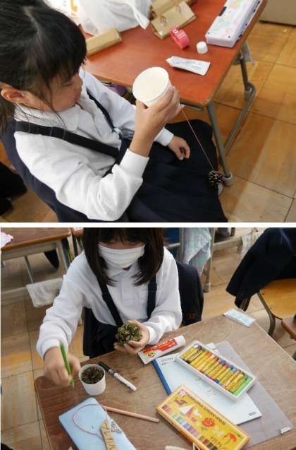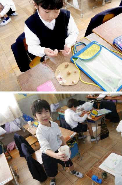 1年生が、松ぼっくりやドングリを使って、けん玉などのおもちゃを作って楽しんでいました。