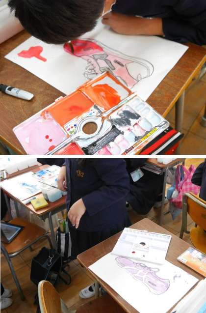 5年生では、自分の運動靴の絵を描いています。とてもていねいに絵の具を重ねて塗っています。