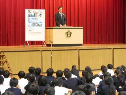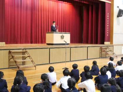 全校朝会をおこないました。本校5年生が、学校給食献立コンクールで佳作となりましたので表彰いたしました。校長先生からは今日から12月10日まで人権週間になっており、「みんなちがって、みんないい」と詩を紹介しました。