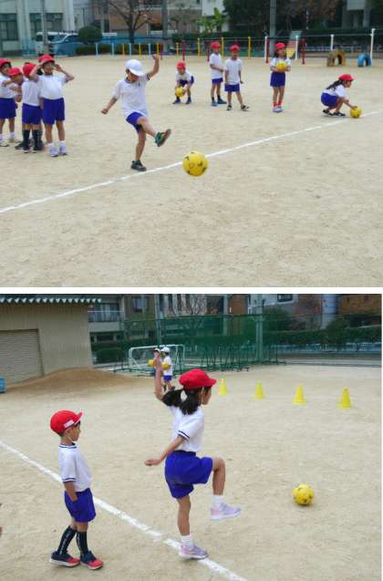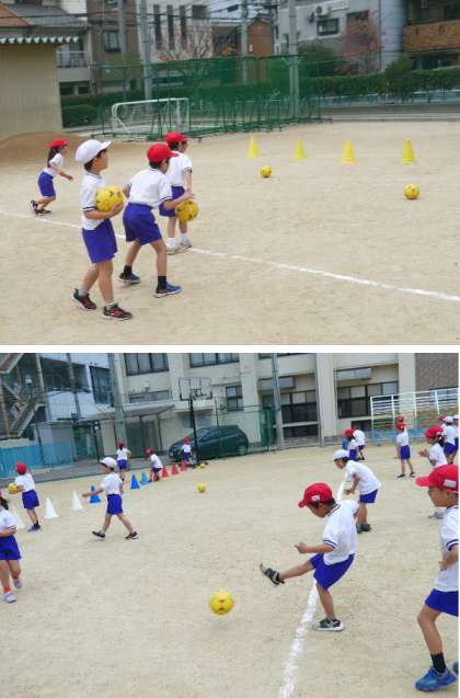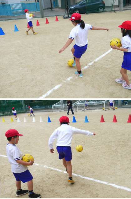 1年生の体育では、ボールける競技をするために、ボールけりの練習をしています。