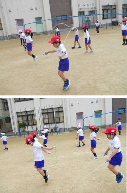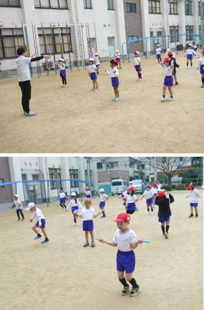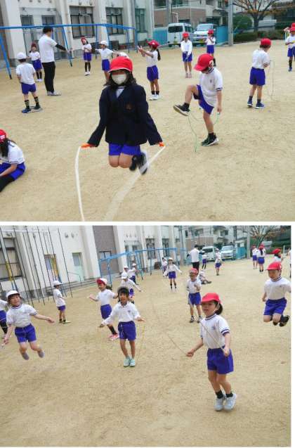 1年生がなわとびの練習をしています。3学期には業間なわとびもあります。しっかりとべるように練習しておきましょう。とぶタイミングと腕の動きが少しむずかしいですね。