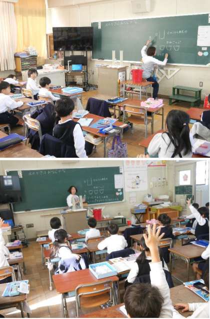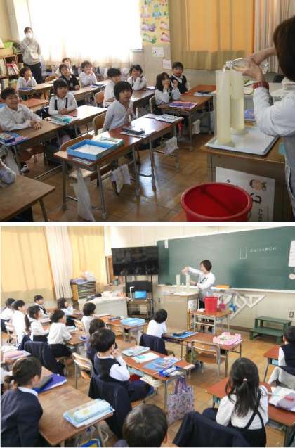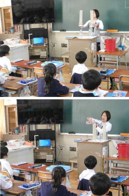 1年生の算数では、ペットボトルに入った水のかさが同じかどうかをどうしたらわかるかを考えています。同じメスシリンダーに移したり、紙コップではかったりと、いろいろなアイデアが子ども達からでてきました。実際にためしてみると、大盛り上がりでした。