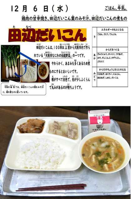 今日の献立は、鶏肉の甘辛焼き、田辺だいこん葉のみそ汁、田辺だいこんの煮もの、ごはん、牛乳でした。