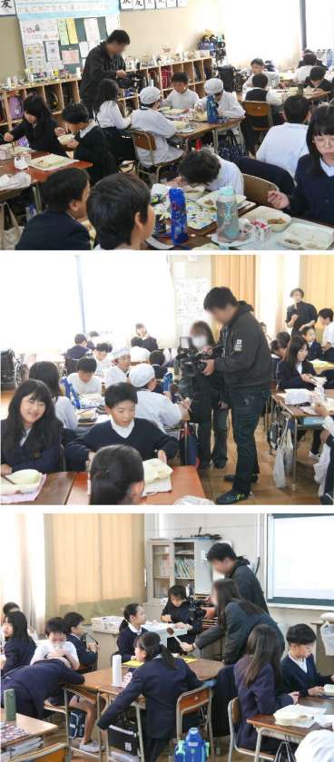 今日は「田辺だいこん」がメニューに登場するので、大阪市教育委員会の依頼で、給食風景が撮影されることとなりました。インタビューに答える子どももいました。