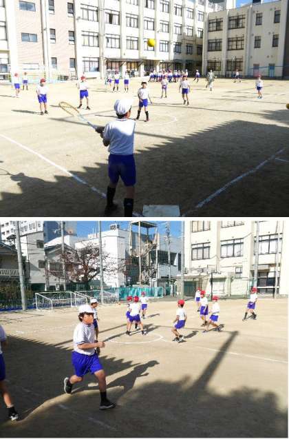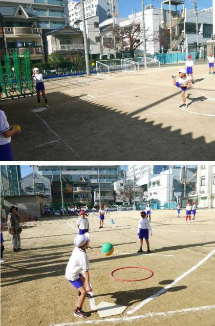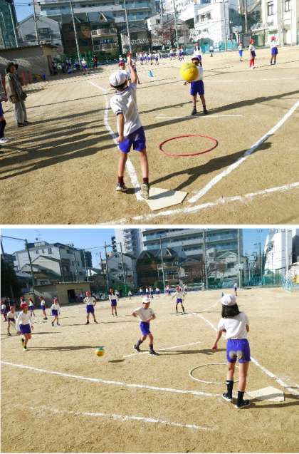 4年生は、三角にベースを置いて、ボールを手やラケットで打ってゲームをしています。野球のようなゲームです。元気いっぱい楽しんで運動しています。