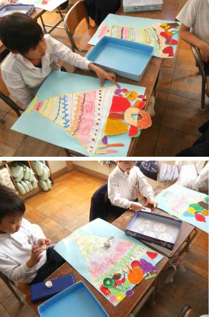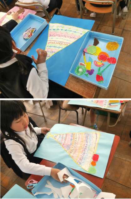 1年の作品展に出す作品づくりが完成に近づいています。大きなパフェへのデコレイトする絵を描いて切って貼り付けています。