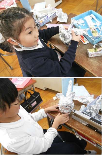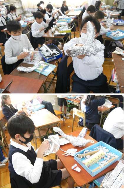 3年生では、アルミ箔を丸めた作品を作っています。生き物を作っているようです。