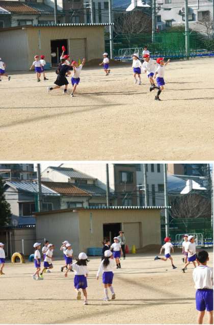 1年生の体育では最初におにごっこをして身体をほぐしていました。