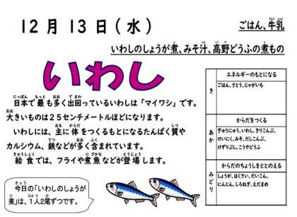 今日の献立は、いわしのしょうが煮、みそ汁、高野どうふの煮物、ごはん、牛乳でした。