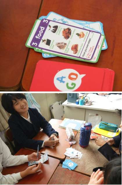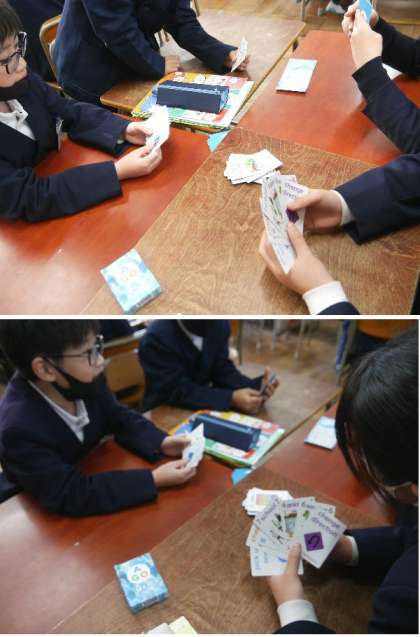 英語で書かれたカードゲームをしていました。カードや説明書の英文を見ながらカードで楽しく取り組んでいました。