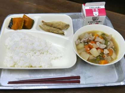 今日の献立は、きびなごてんぷら、含め煮、焼きかぼちゃの甘みつかけ、ごはん、牛乳でした。
