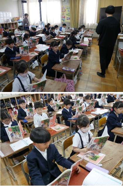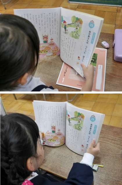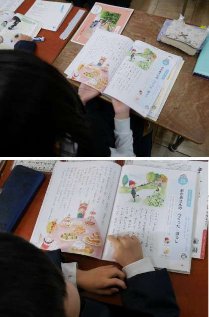 1年生の道徳で、「おかあさんの作った帽子」を音読していました。大好きな家族について考えます。