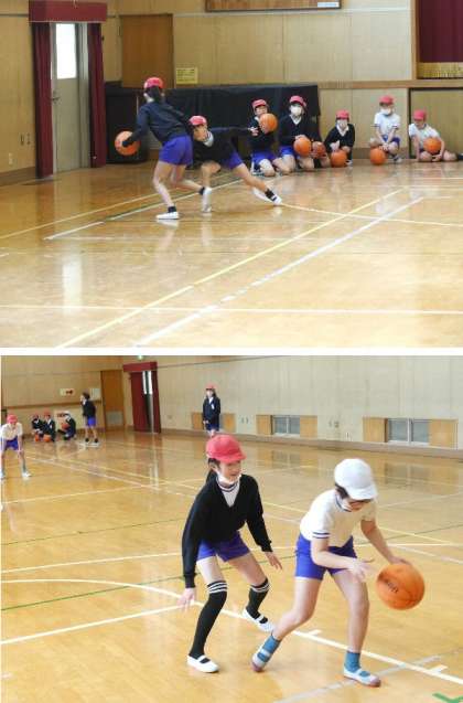 5年生が体育館でバスケットボールの練習をしています。攻守に分かれて練習です。