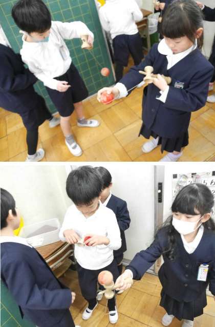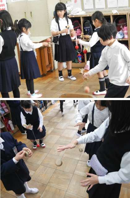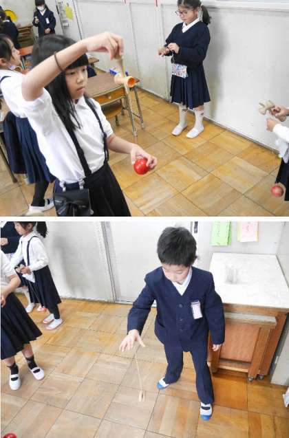 1年生が、けん玉やヨーヨーで遊んでいました。けっこう難しいですね。